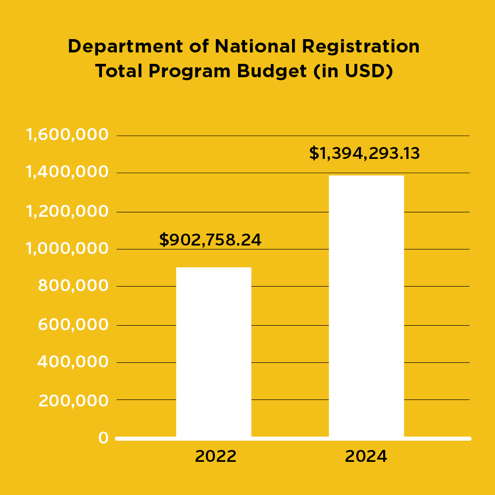 DNR’s approved budget increased by US$491,535 from 2022 to 2024, representing a 54% increase. The budget of the Maldives’ Digital Identity program, which sits within the National Center for Information Technology, increased by US$268,980 during the same period.