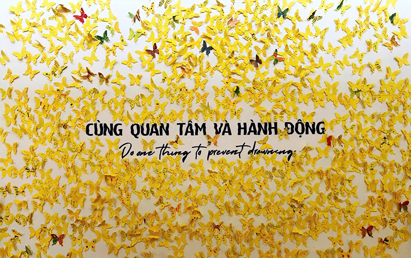 A wall of messages at the art exhibition on drowning prevention in Ha Noi in 2022.